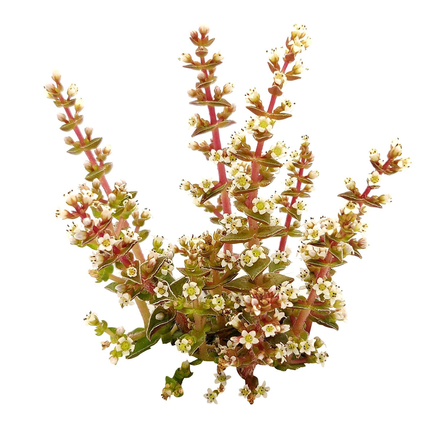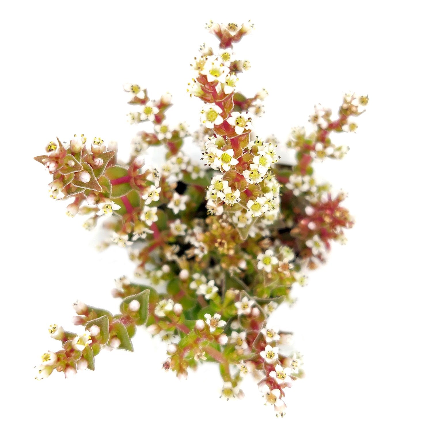- Thyrsiflora ‘Pagoda Village’ produces tiny white or pink flowers from mid-summer to early fall.