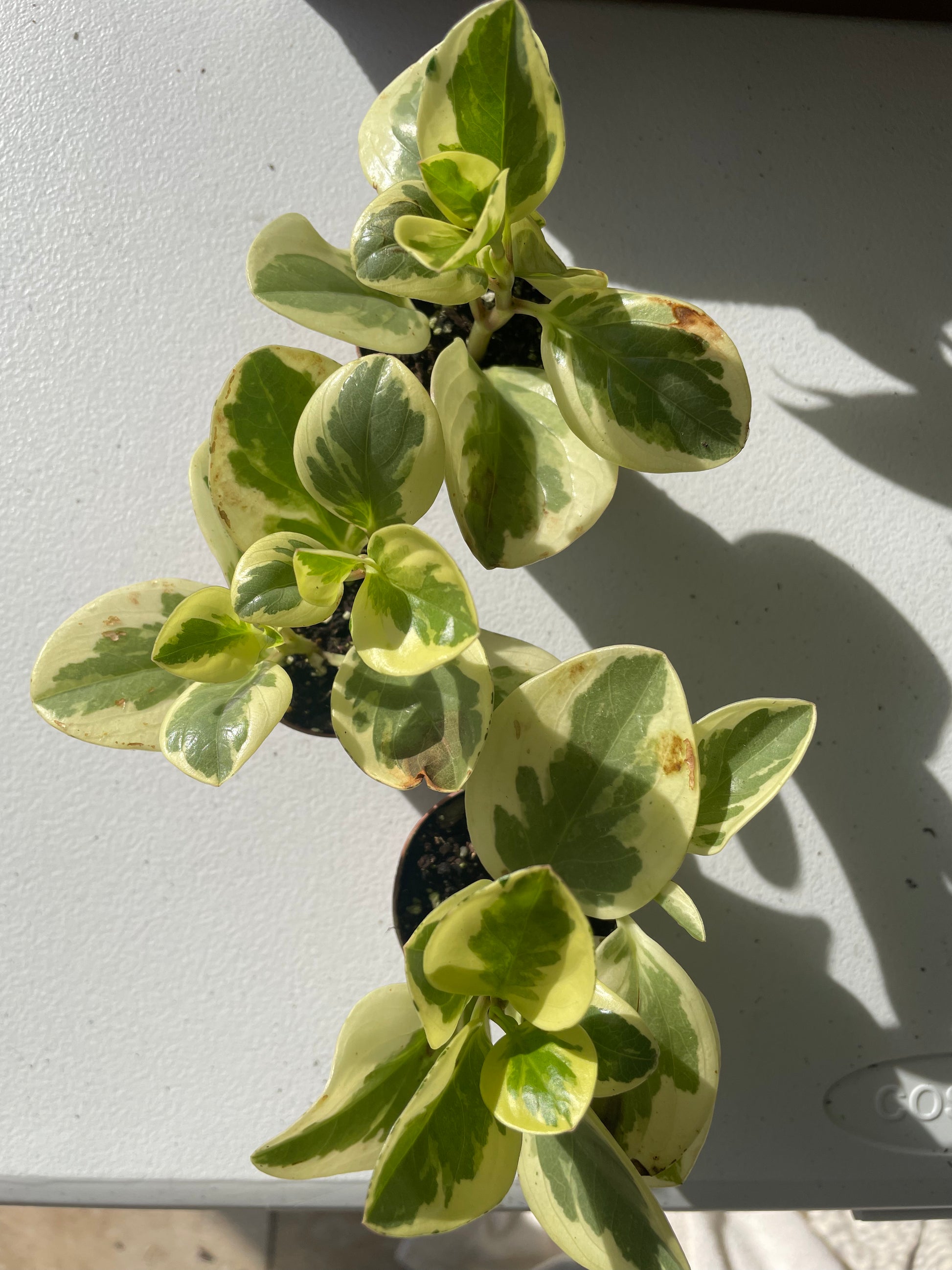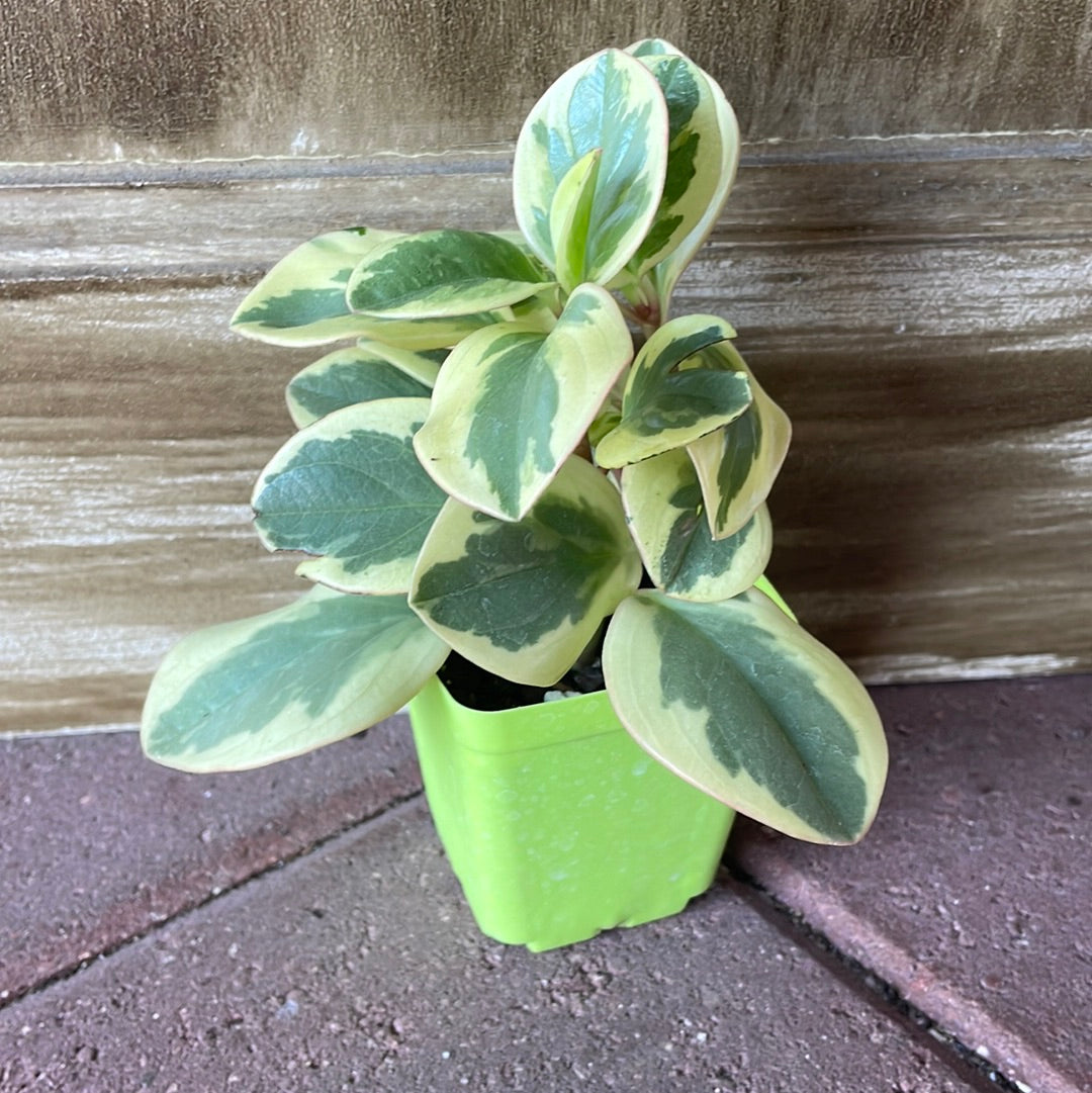 AKA American rubber plant, baby rubber plant, or pepper faced plant. This variegated plant has a white and green leaves that are shiny and smooth.