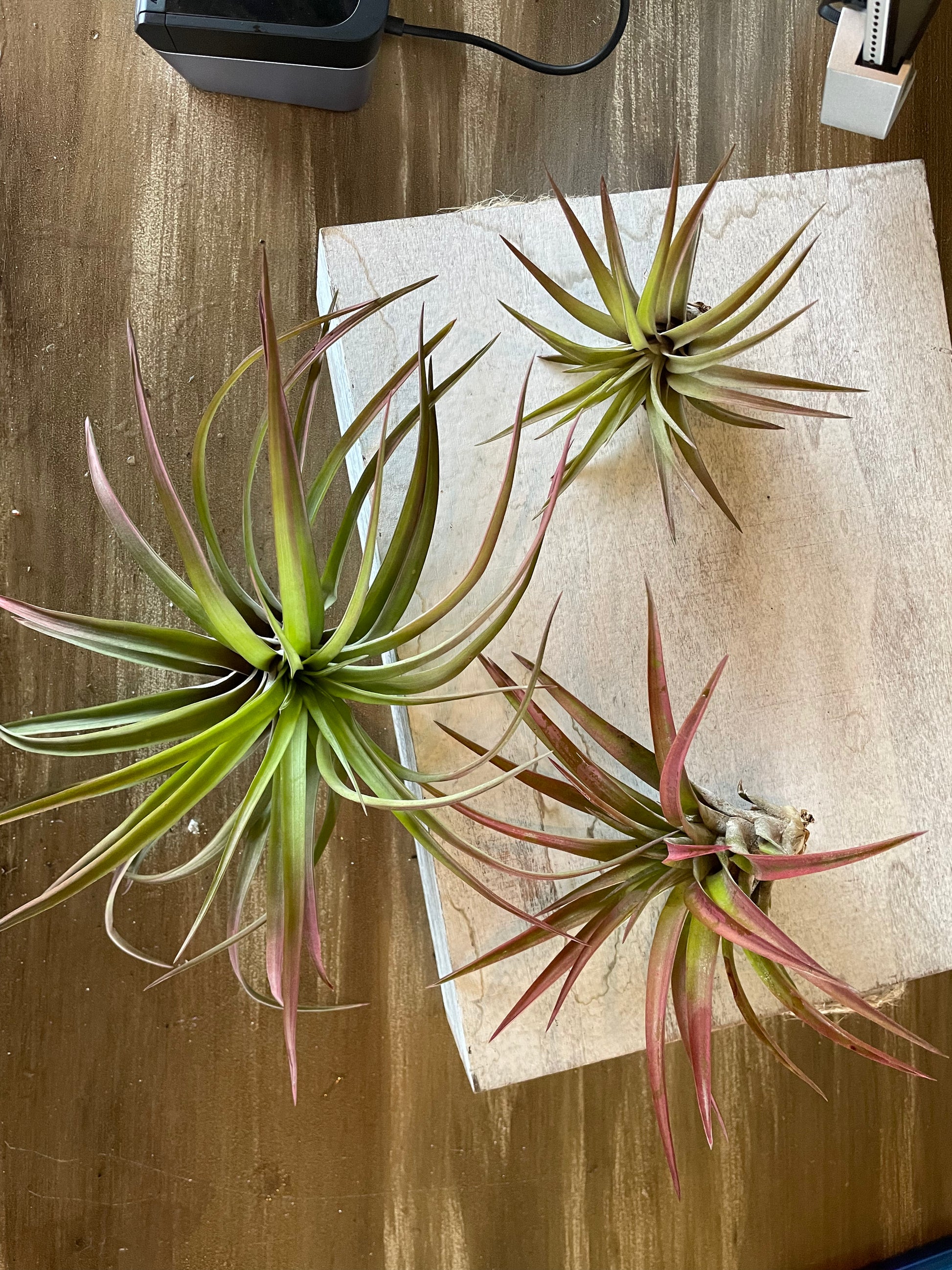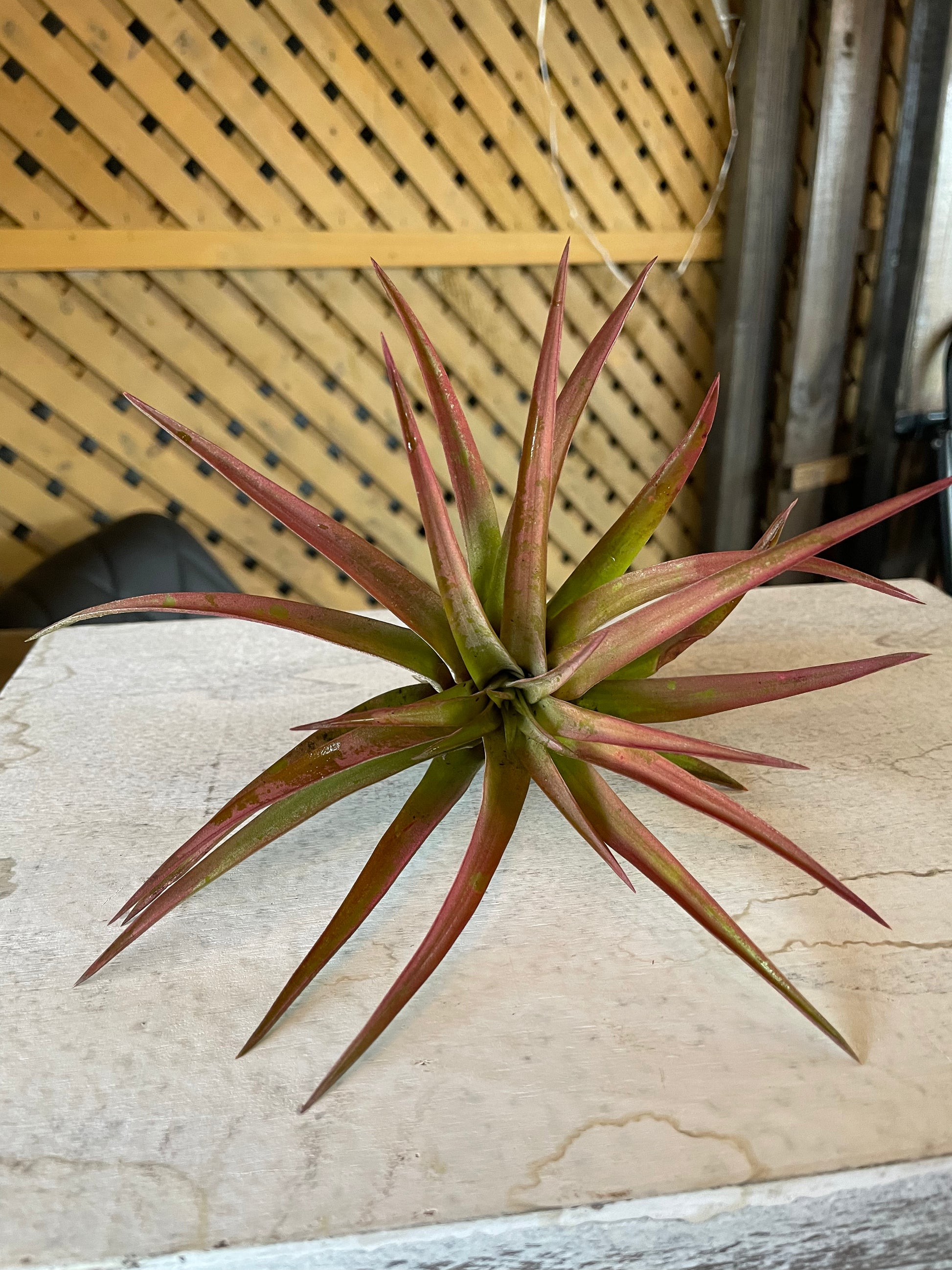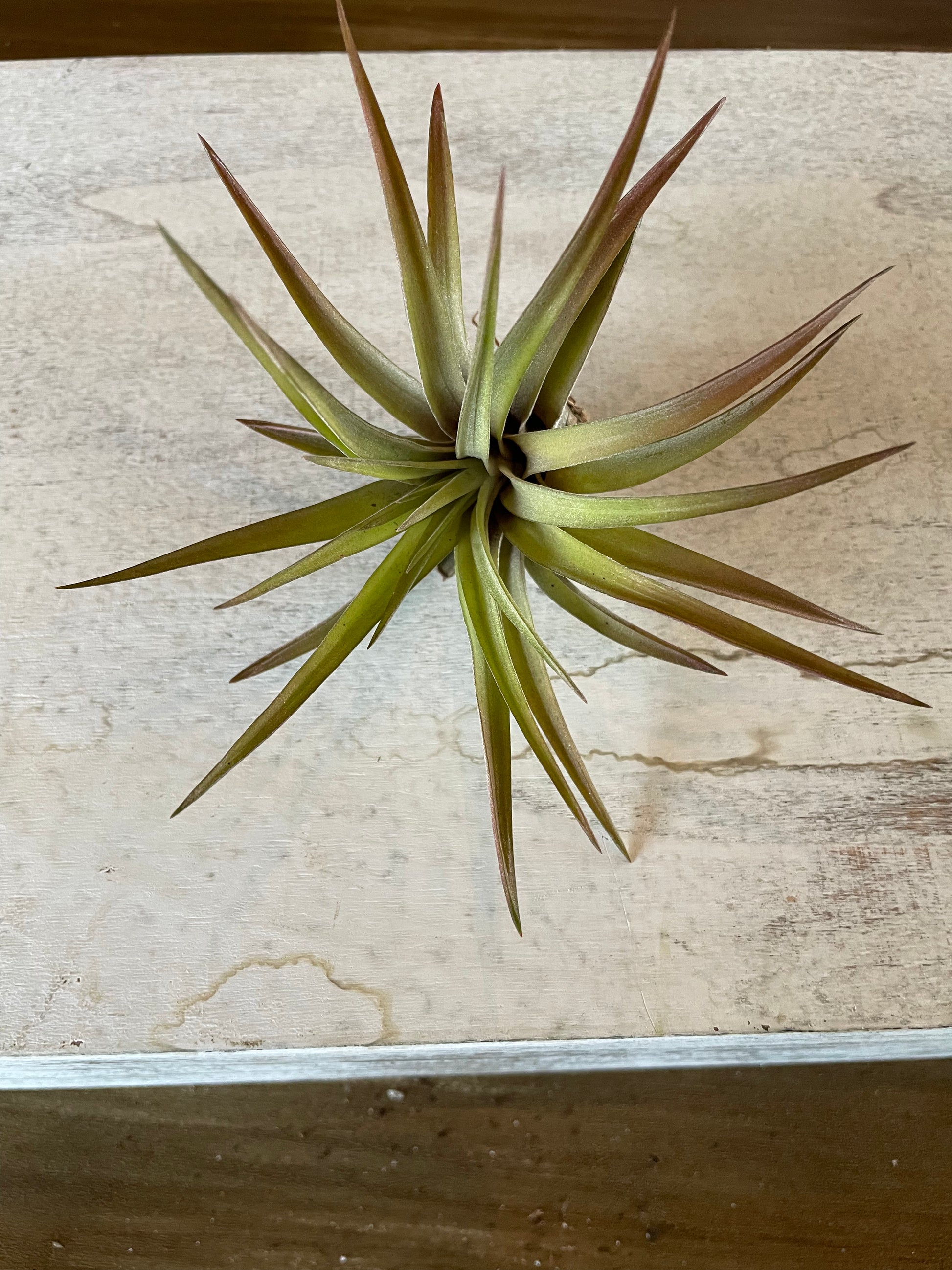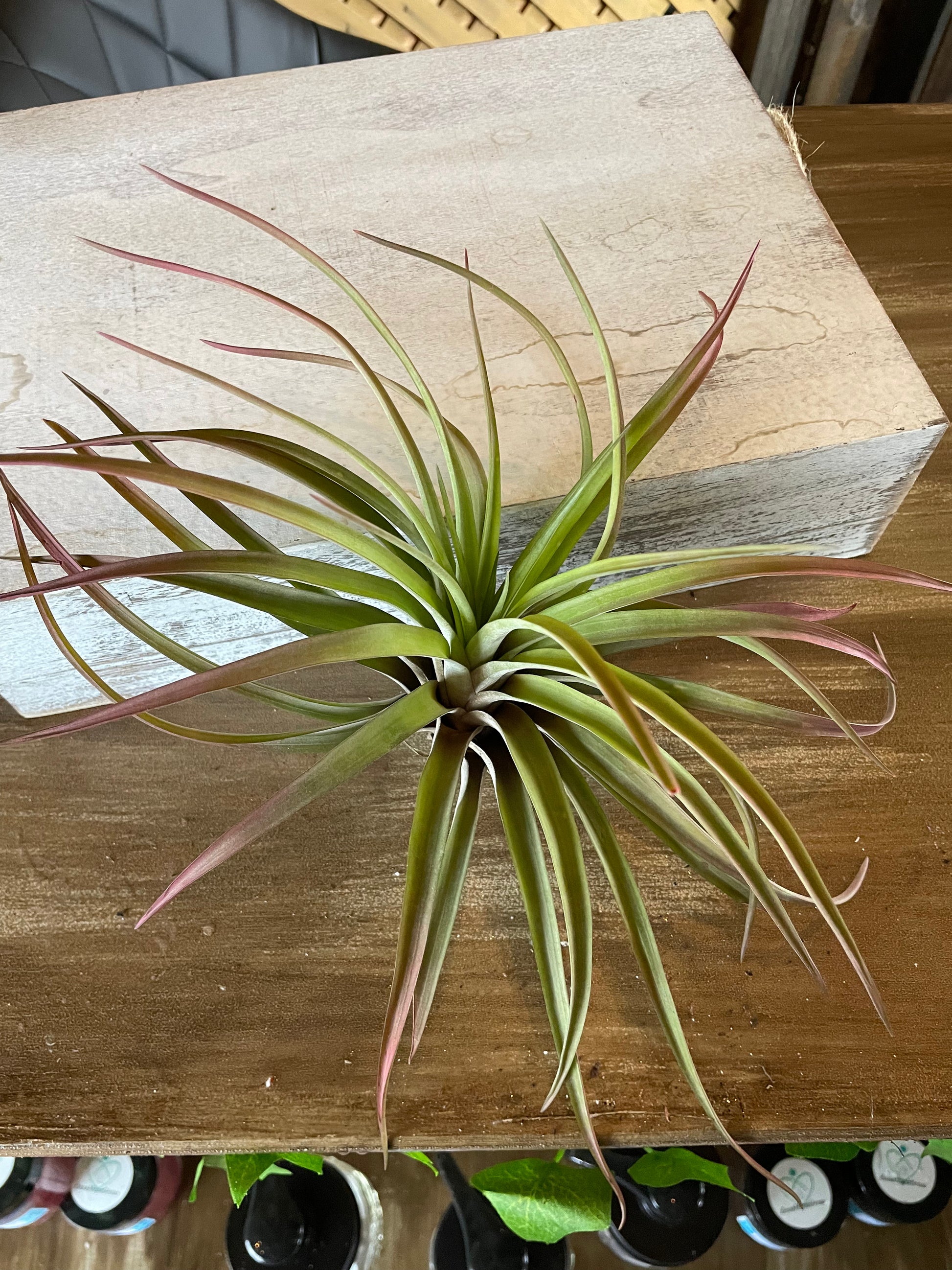 Air plant that has a deeper reddish maroon type tips and darker towards the base. Leaves are darker green.